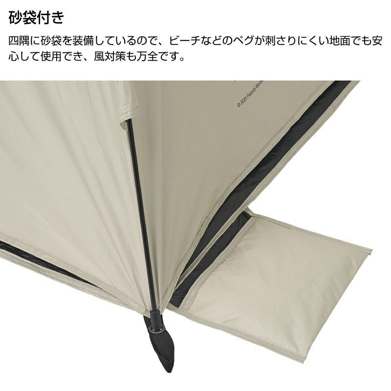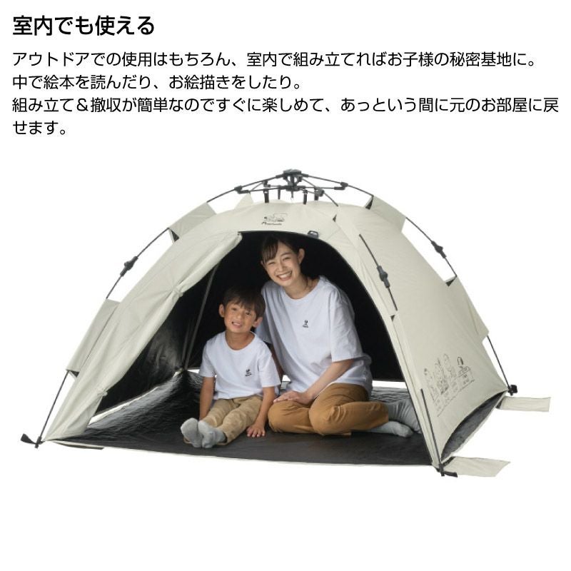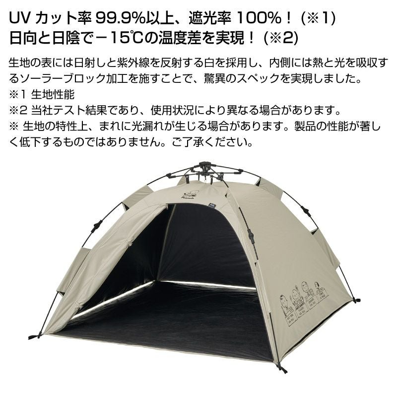 UV-CUT率99.9%、遮光率100%。設営約30秒のワンタッチ日よけテント。