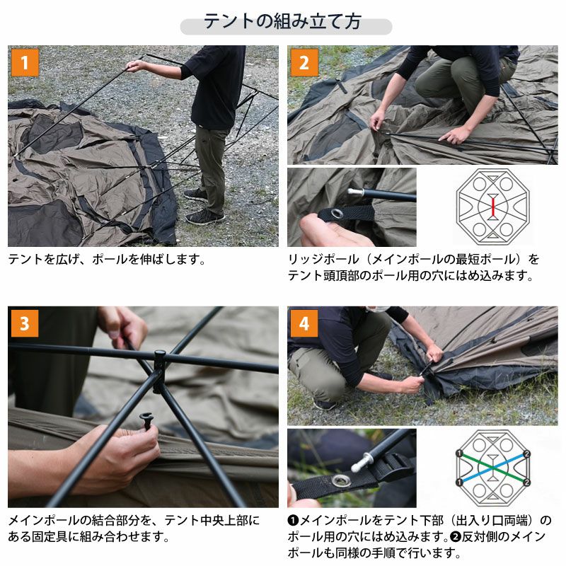 一体型のメインポール1本とサブポール2本で構成された「3POLE HUBシステム」を適用した組み立てやすい大型テントです。