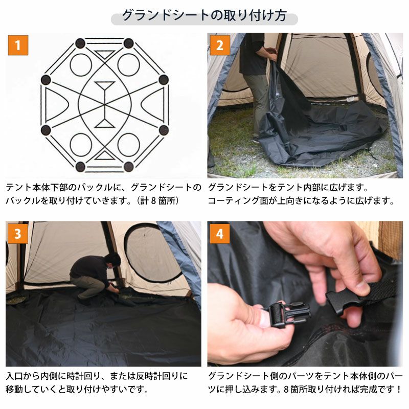 標準装備のグランドシートはバックルがついているため簡単に取り外し可能です。