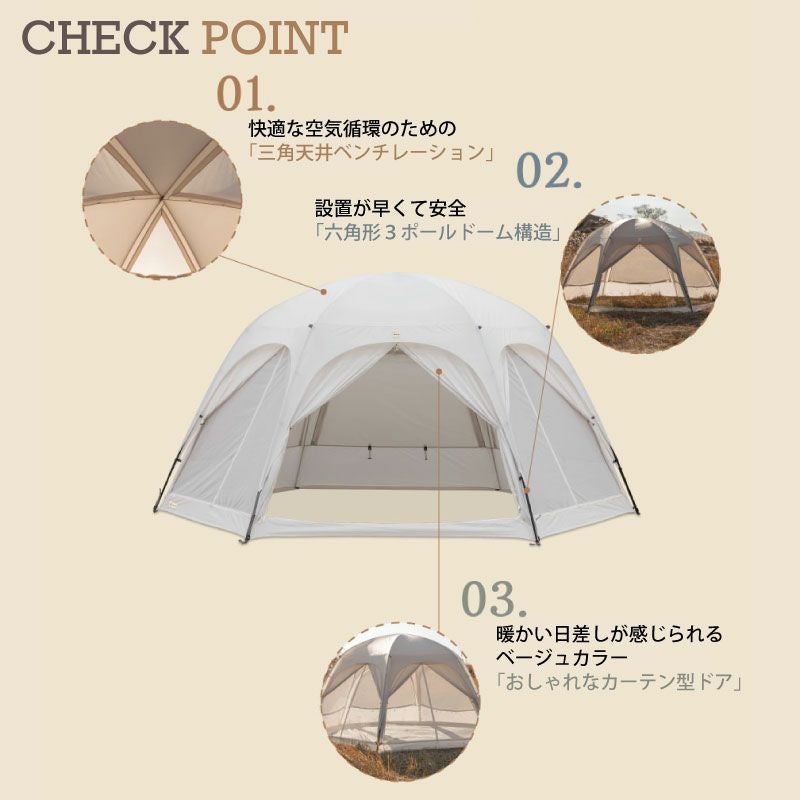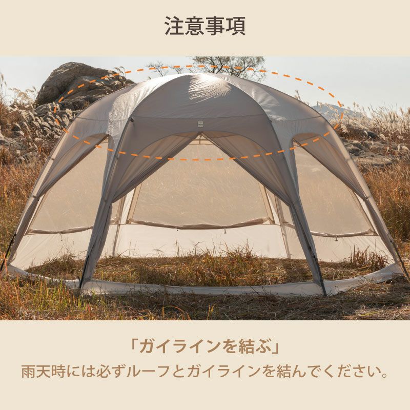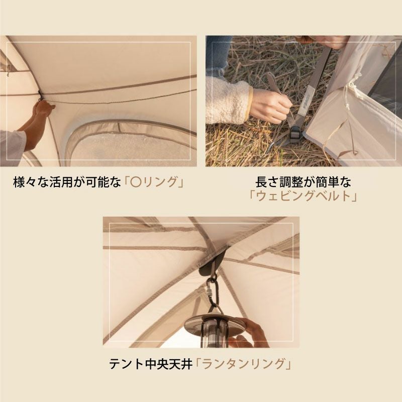 ゆったりとした大きさのメッシュウィンドウと天井ベンチレーションは暖かい日差し、 綺麗な風景の両方が楽しめる自分だけのシェルターです。