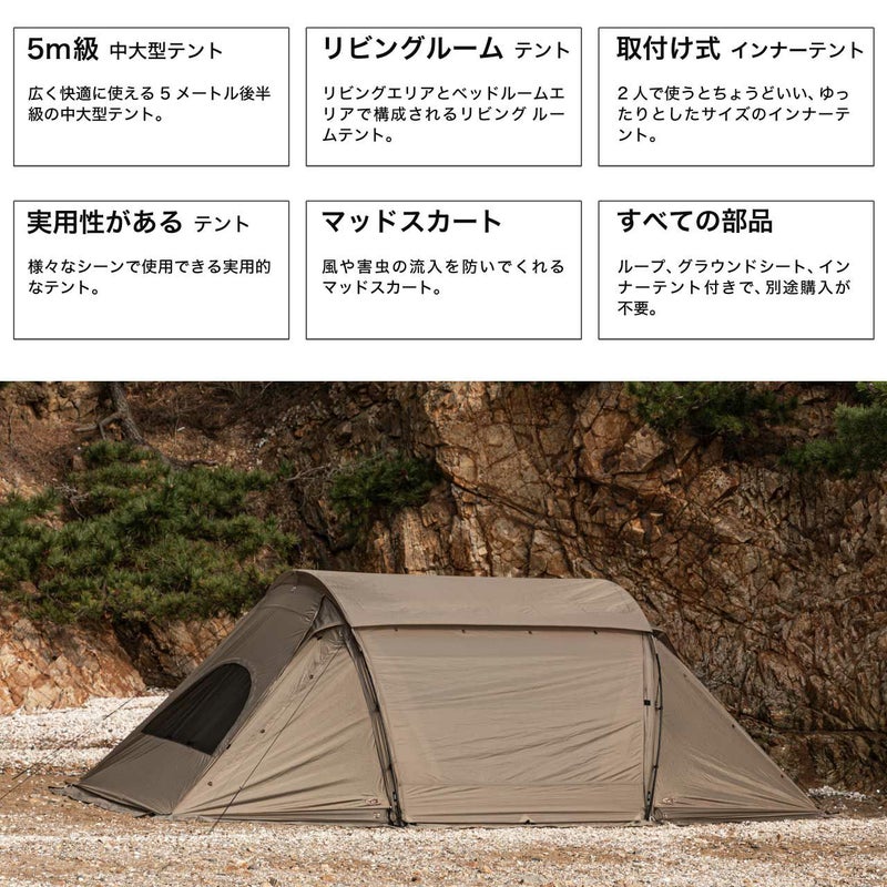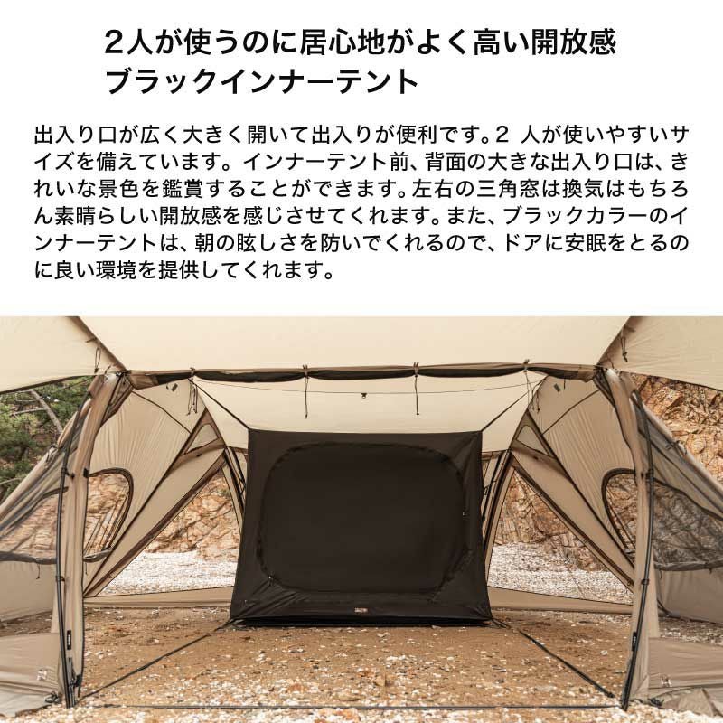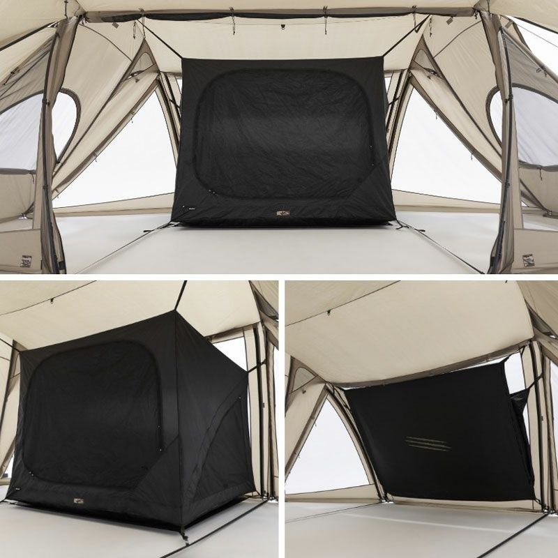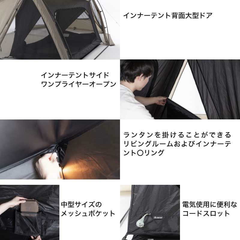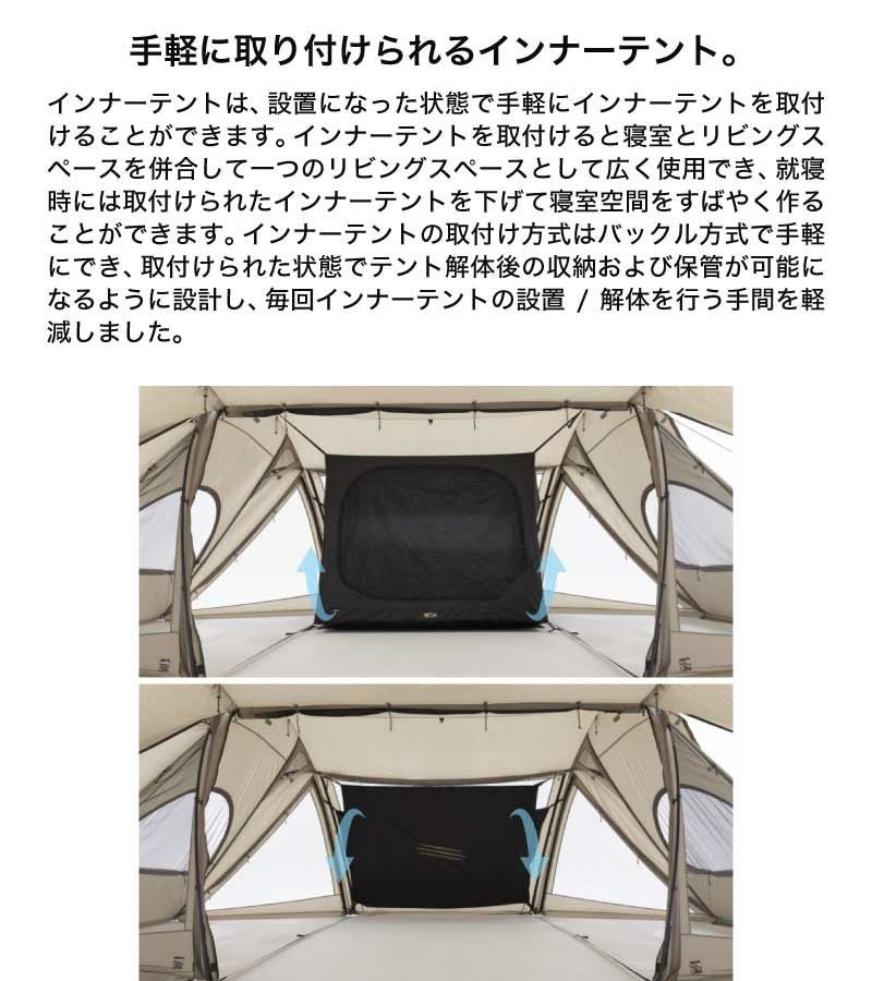 また、折りたたみ式のインナーテントを採用し、昼間は広いリビングとして、就寝時には寝室空間を簡単に作ることができます。