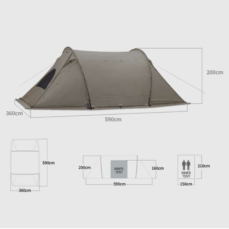 本体:360×590×200cm(設置時) / インナーテント - 150×210×160cm(設置時) / グラウンドシート - 145×200cm