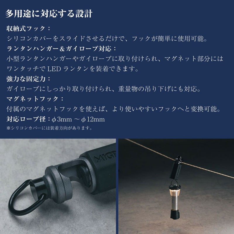 さまざまなシチュエーションに対応し、これひとつでキャンプのあらゆる場面で活躍するマルチフック。