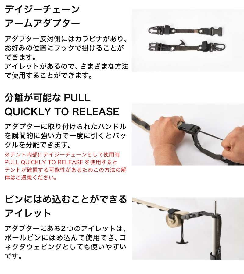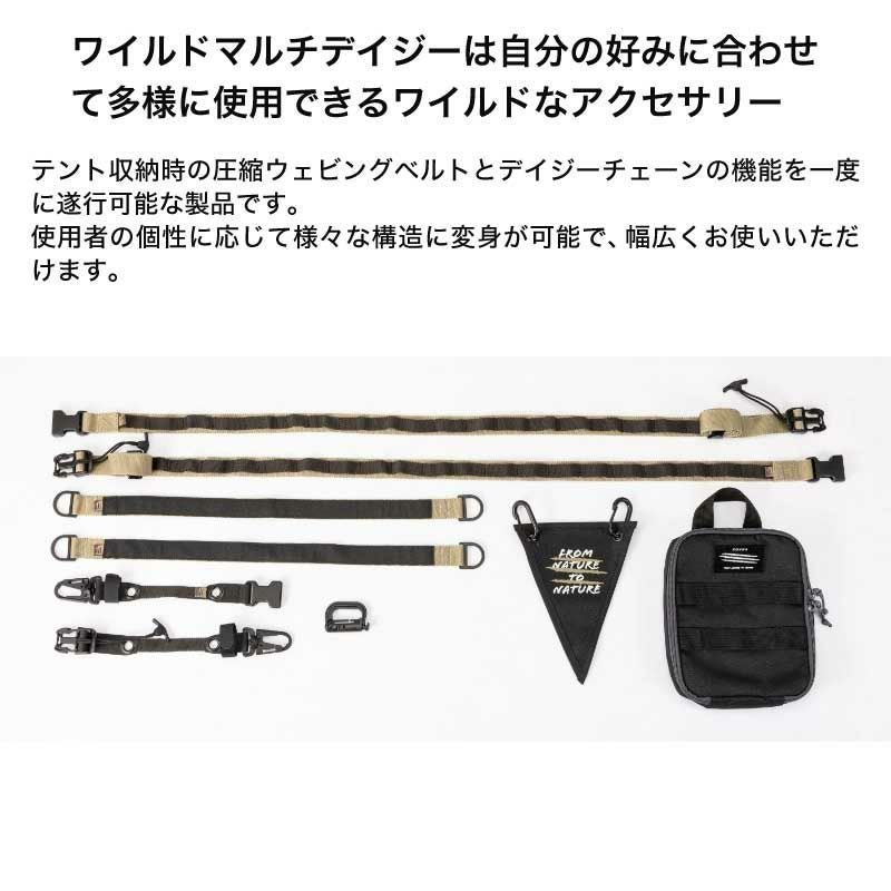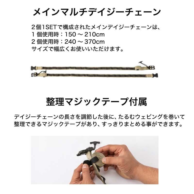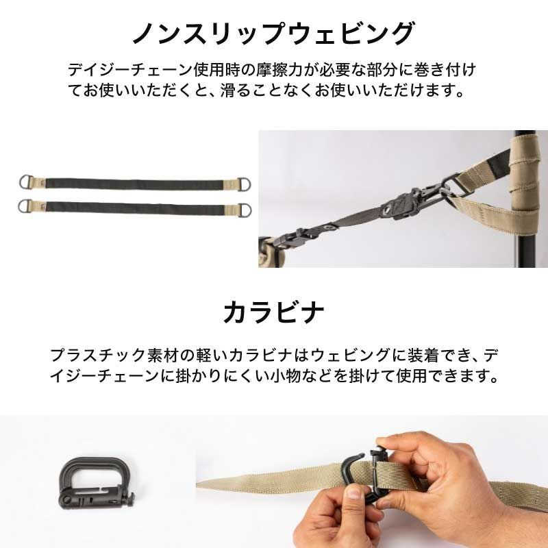 様々な構成でデイジーチェーンだけでなく、圧縮ウェビング、タープ設営時のコネクションウェビングなど多様な役割を同時に行うマルチデイジーチェーンです。