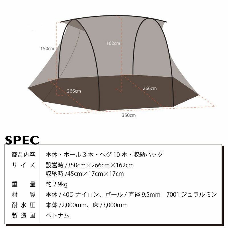 サイズ:設営時/ 350cm×266cm×162cm、収納時/ 45cm×17cm×17cm