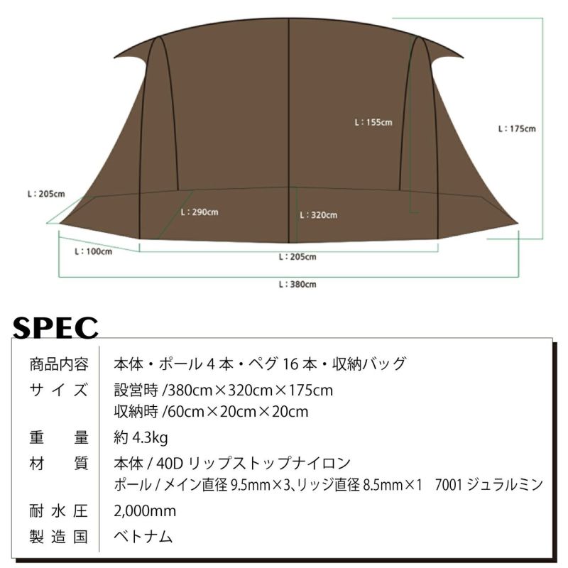 サイズ:設営時/ 380cm×320cm×175cm、収納時/ 60cm×20cm×20cm