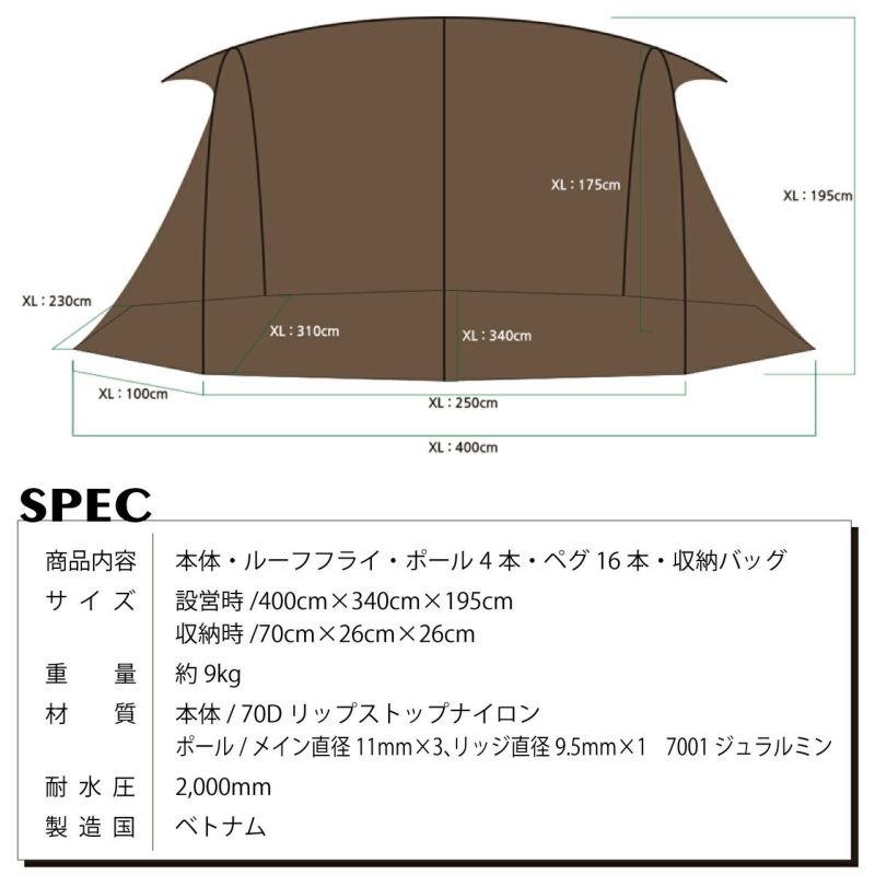 サイズ:設営時/ 400cm×340cm×195cm、収納時/ 70cm×26cm×26cm