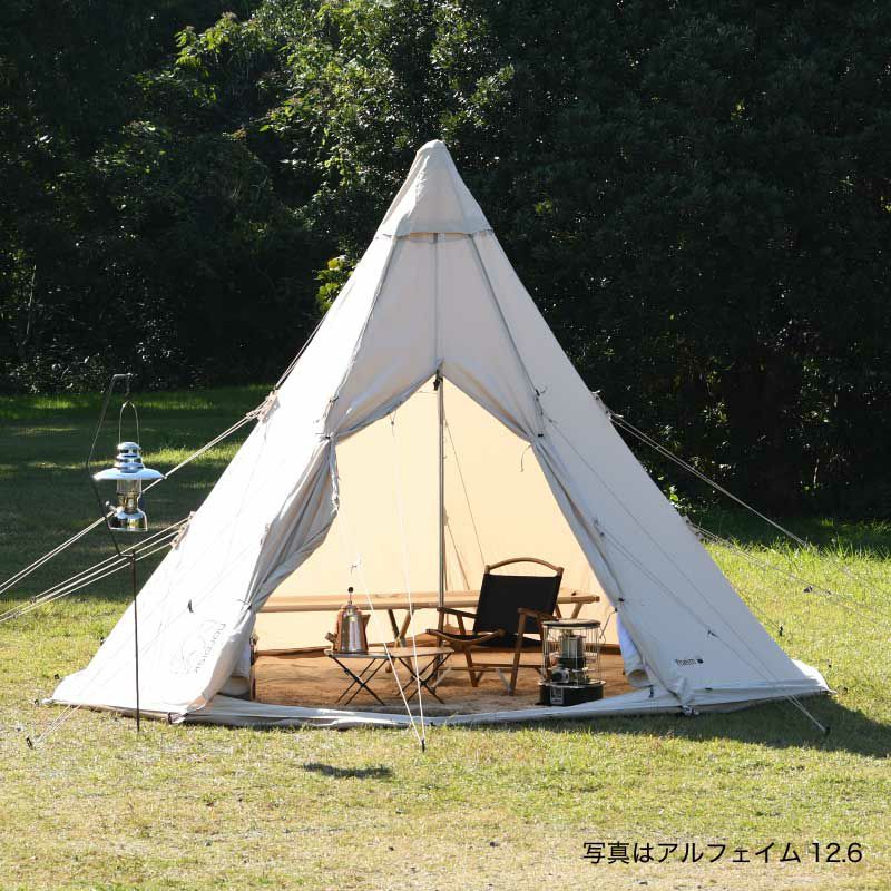 【2~7人専用!Nordiskの代表モデル!!ティピ型テント Alfheim 19.6 Basic Cotton Tent(アルフェイム 19.6 ベーシック コットン テント)】 クラシカルなティピ型で綺麗な円錐型モデル。トップにベンチレーションが付いており、フロアを外せば、中で料理や小さな焚火も可能です。センターポール1本だけで簡単に組み立てることができます。上のベンチレーションは中から調節可能。 優れたベンチレーション機能で室内環境も快適。窓と出入り口はメッシュ付きで虫よけも安心。インナーキャビンは別売りです。