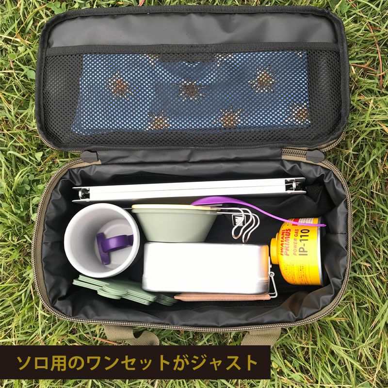 コンパクトでありながら使い勝手の良いサイズです コンパクトバーナー, ガスカートリッジ,メスティン,カップなどの一式が入ります 。