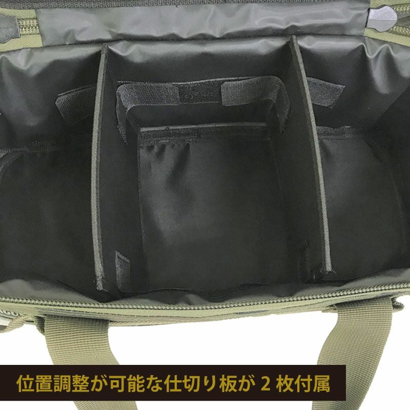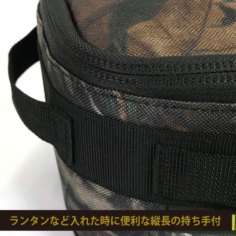 ランタンなども入れられ縦持ちも出来る持ち手付き。上蓋内側に汎用性の高いメッシュポケットが付いています。