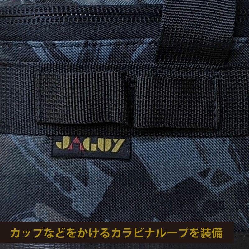 本体にはカップなどを掛けられるカラビナループ JAGUYロゴ入りカラビナ型ボトルオープナー付き。