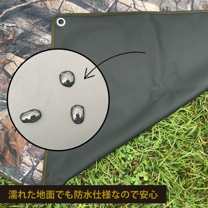 雨あがり、露なので濡れた地面でも防水仕様なので安心、 生地表面も撥水処理をしているので飲み物をこぼしてもさっと拭いてもらえばOK。