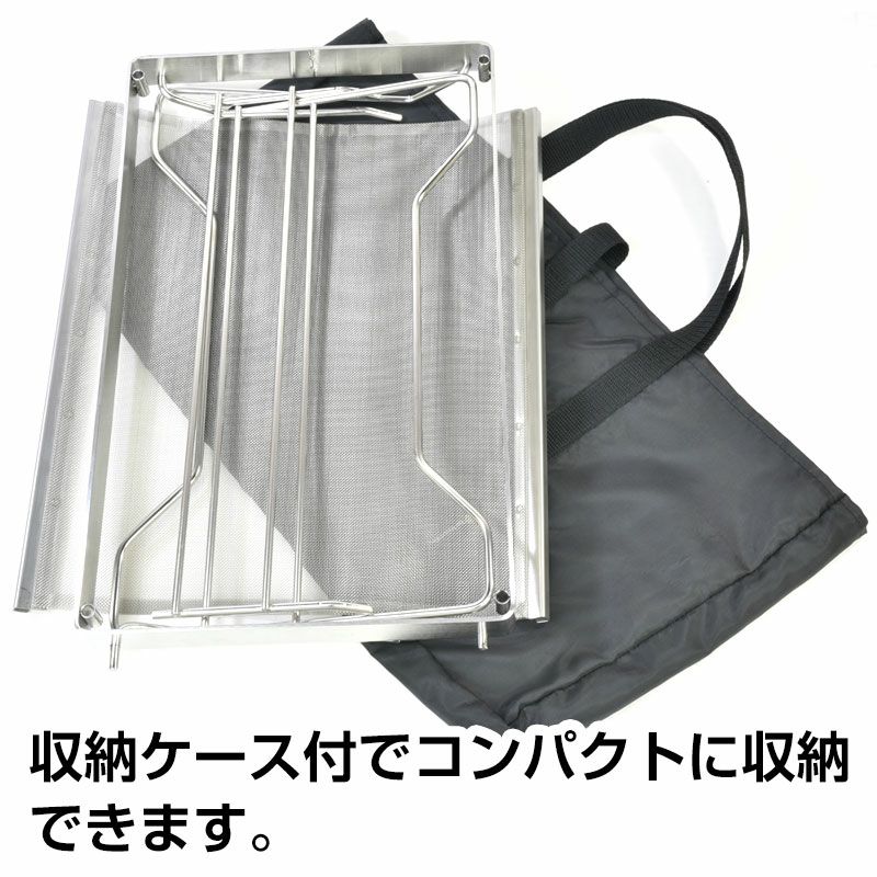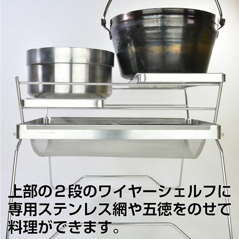 上部に取り付けた上下2段のワイヤーシェルフに五徳やロストル等をのせて料理ができます。