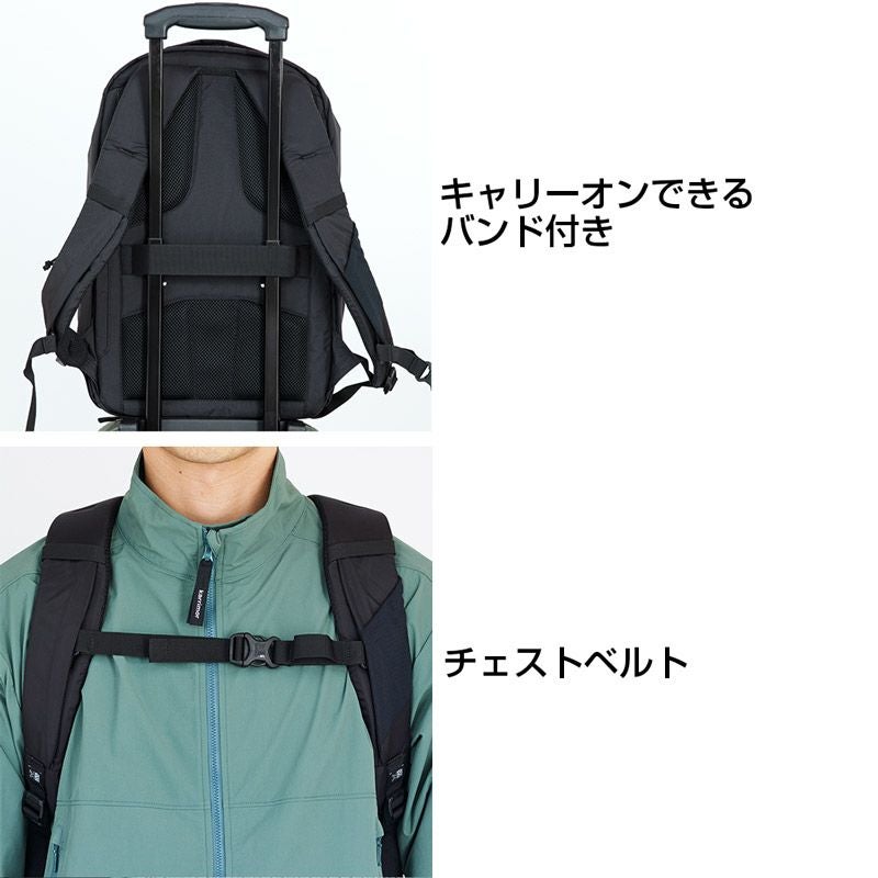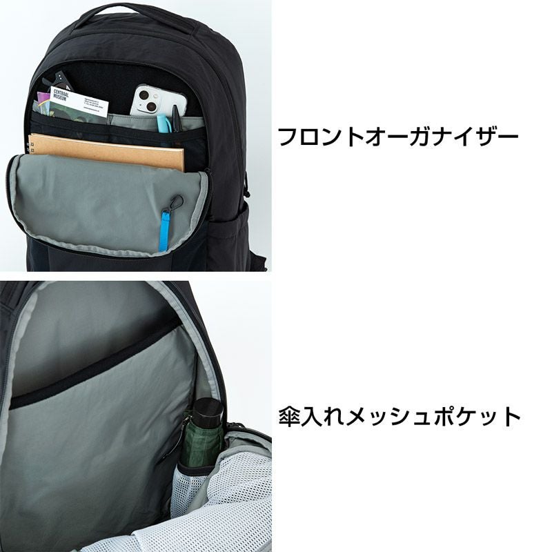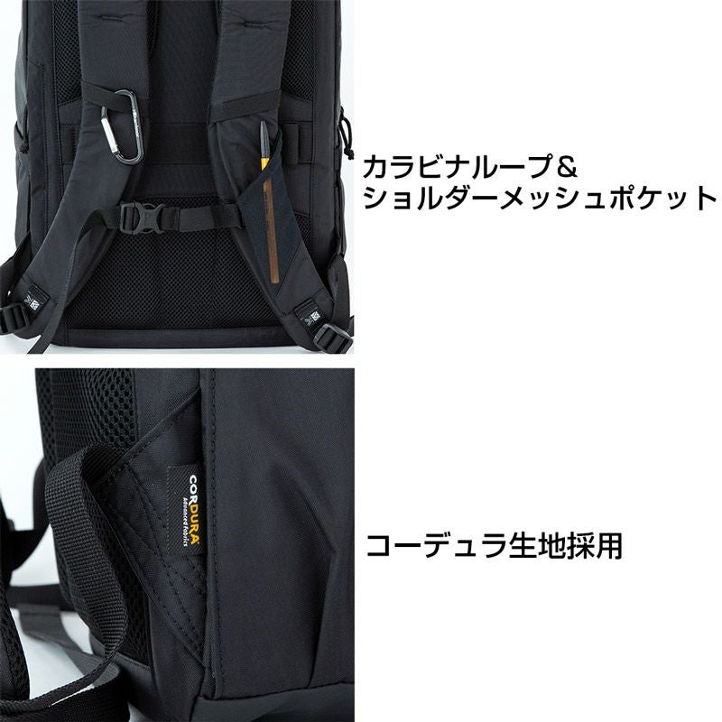 シンプルなデザインながら、サングラスやメガネを直接収納可能な起毛素材を使用したポケットなど、旅行や日常使いに便利な充実の機能を備えた中型リュックサック。耐久性に優れたCORDURA生地を使用し、耐摩耗性に優れたPCコーティング加工を採用。背面はキャリーケースのハンドルに取り付けることが可能。