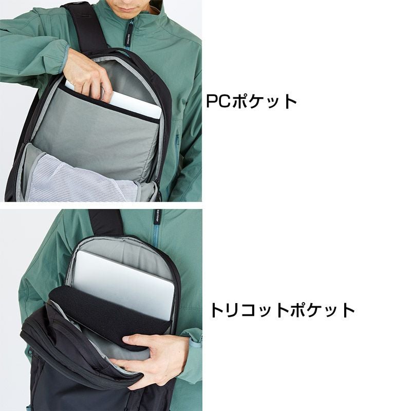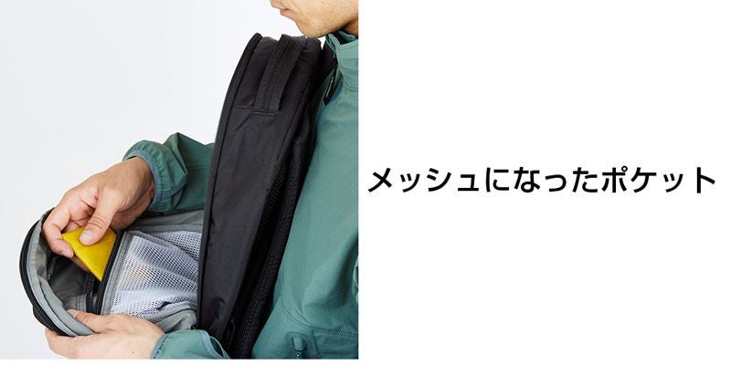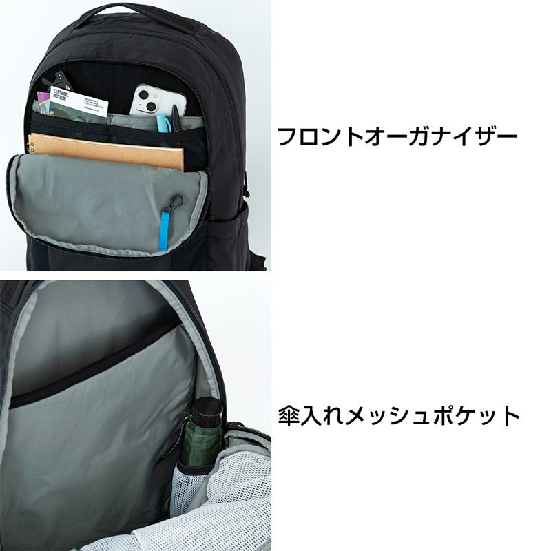 シンプルなデザインながら、サングラスやメガネを直接収納可能な起毛素材を使用したポケットなど、旅行や日常使いに便利な充実の機能を備えた中型リュックサック。