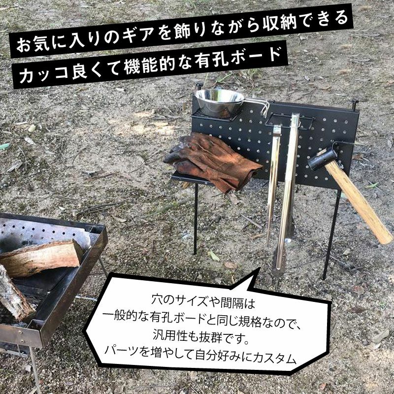アレンジ性抜群の有孔ボードに焚き火アイテム、料理道具などをひとまとめに収納できるので、