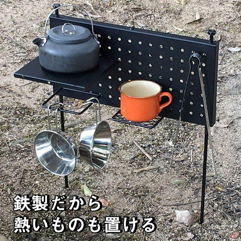 ■鉄製なので熱いクッカーなどが置けて便利。引っ掛け部品の配置を変えるだけでいろんなシーンに対応してくれます。