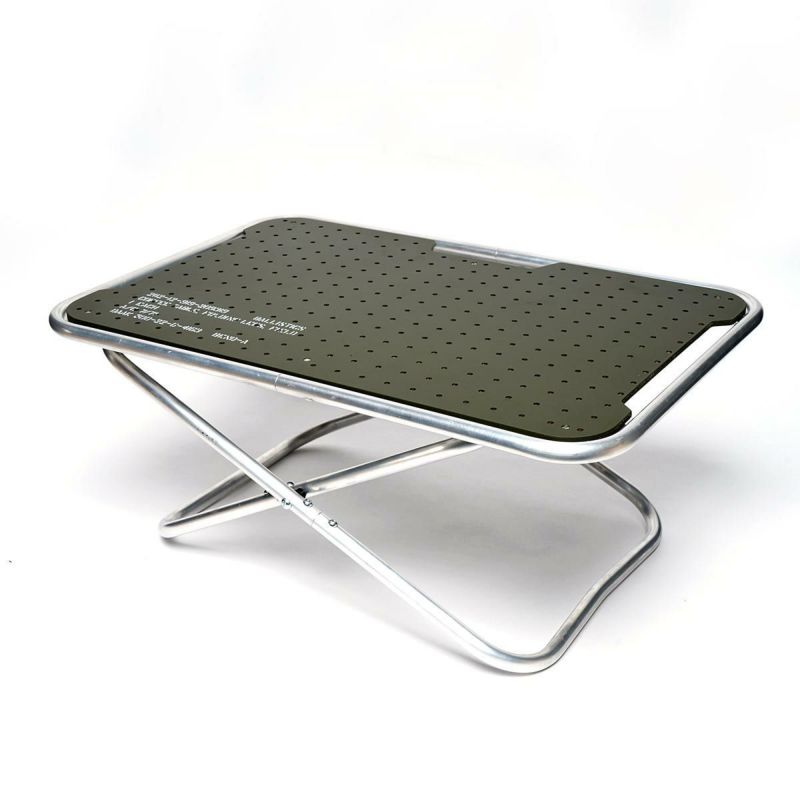 小型のローバーテーブルになります。 気軽に素早く展開してチェアサイドでコーヒーテーブル的に使えるサイズのテーブルです。 展開方法は、まずレッグパイプをホールドしているベルトを解き、片側のレッグを樹脂製のレッグキャッチに嵌め込みます。 その時点では高さ約26cmのローテーブルになりますが、反対側の脚を内側のレッグキャッチパーツに差し替えることにより約37cmの高さに可変します。 天板長辺のくり抜きは移動時の持ち運び用とランタンポール等をクランプできる場所として、両サイドのくり抜きはシェラカップや道具類を掛けるのに最適です。 アルミパイプをメイン素材としている為、約2.4㎏と軽量であることも特長です。