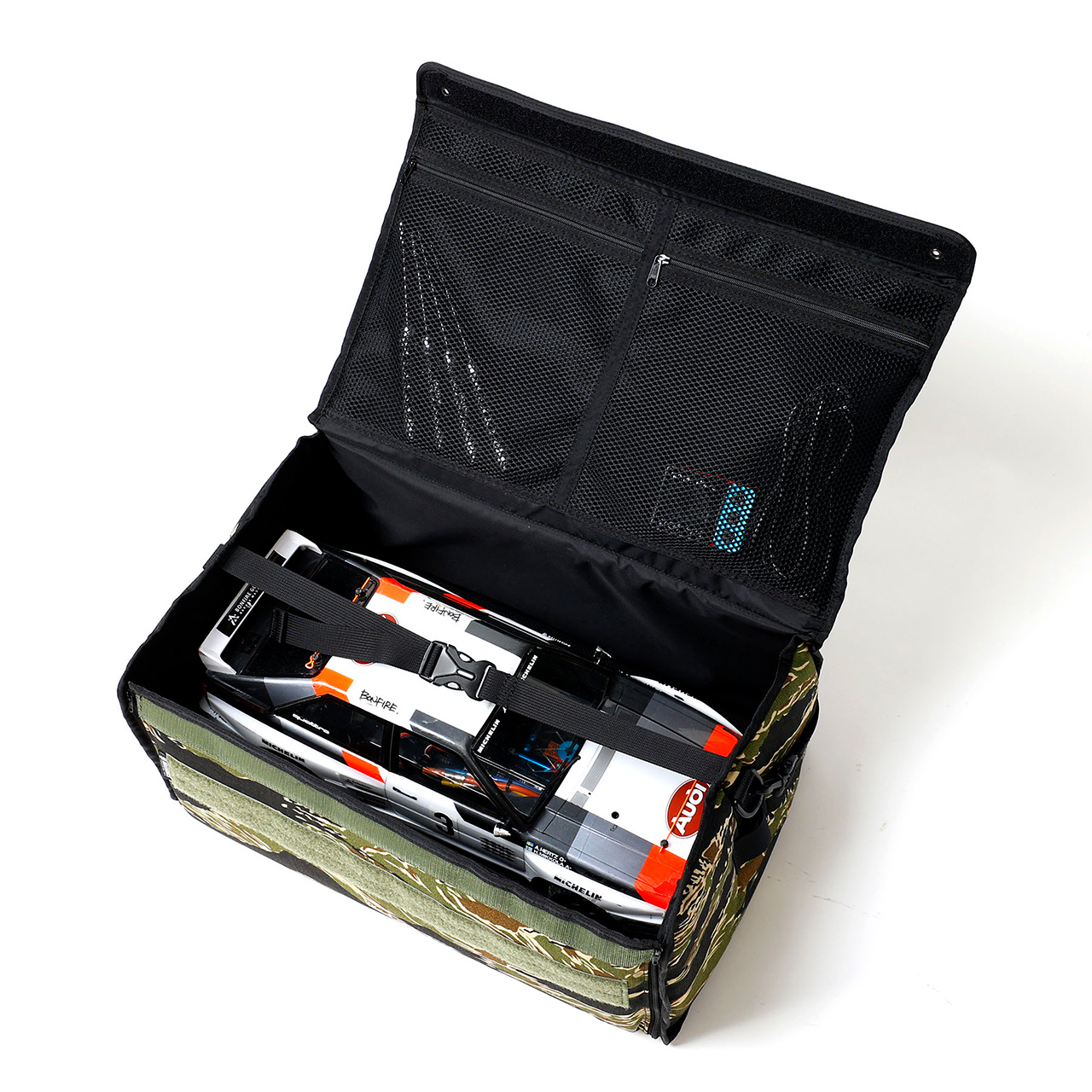 ラジコン本体の保護と携行性を両立した収納ケースです。全面に樹脂製の芯材をインサートしておりますので