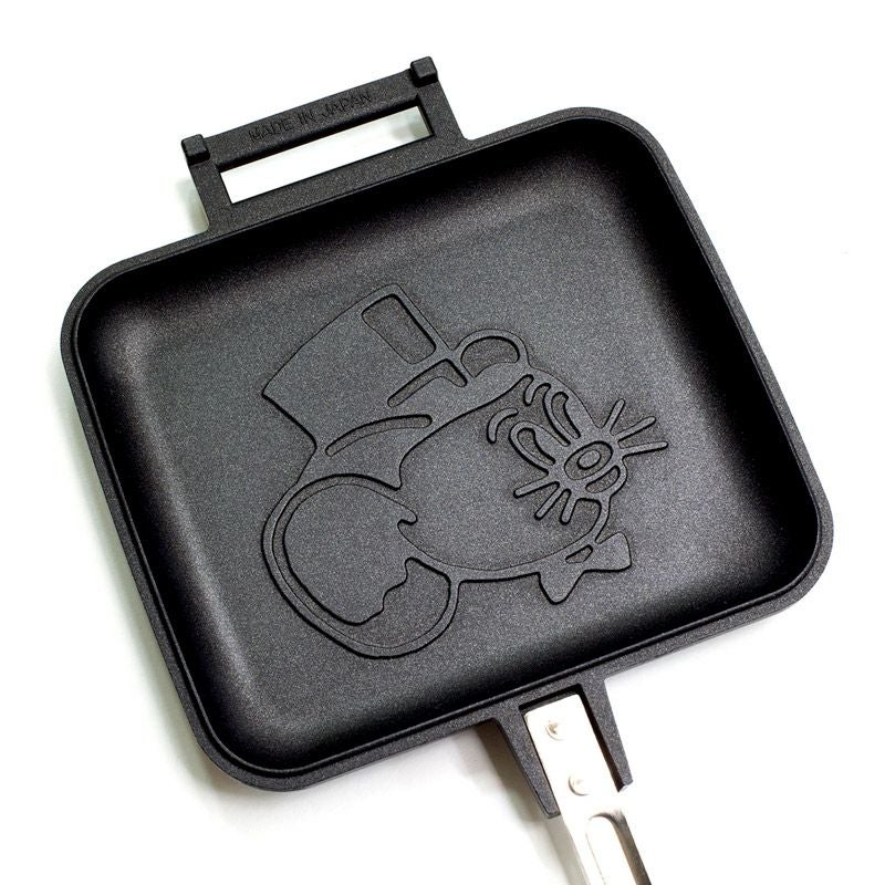 絵が焼ける面を両面とし、片面に「ジェリー・マルケスの顔」、もう一方に「IF MOM AND DAD SAYS NO ASK JERRY」の文字を焼きつけることが出来ます。 表面にも装飾として「ULTRA HEAVY WITH BALLISTICS PRESENTS JERRY MARQUEZ SANDWICH TOASTER」という立体文字をレイアウトしました。 ハンドル上面にはBallisticsとJERRY MARQUEZのコラボロゴ、下のハンドルには「Eating is essential for living,and preparing meals is an important part of Zen practice.」とのメッセージをプリント。 付属するBallistics製の専用収納ケースは「ベージュ」と「OD」の2色からお選びいただけます。又、全体にテフロン加工を施したA面とB面は分割できますので、簡易フライパンとしてもご利用いただけます。