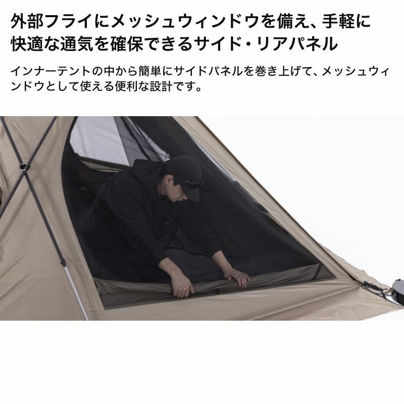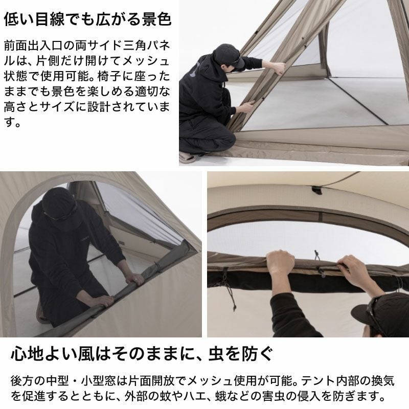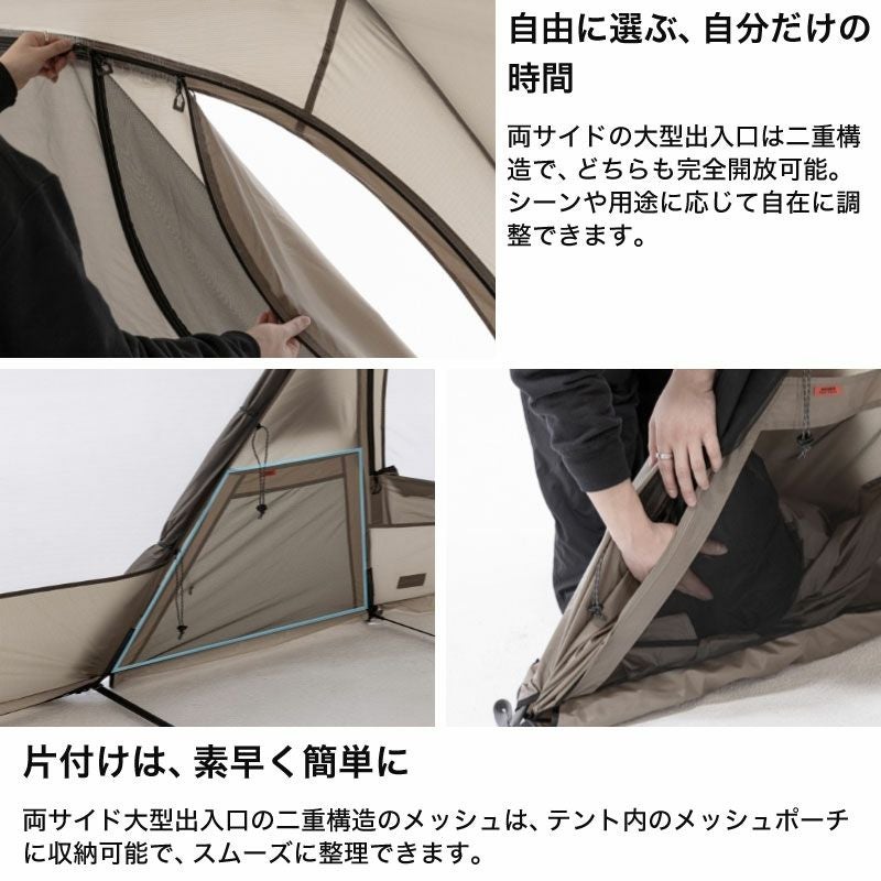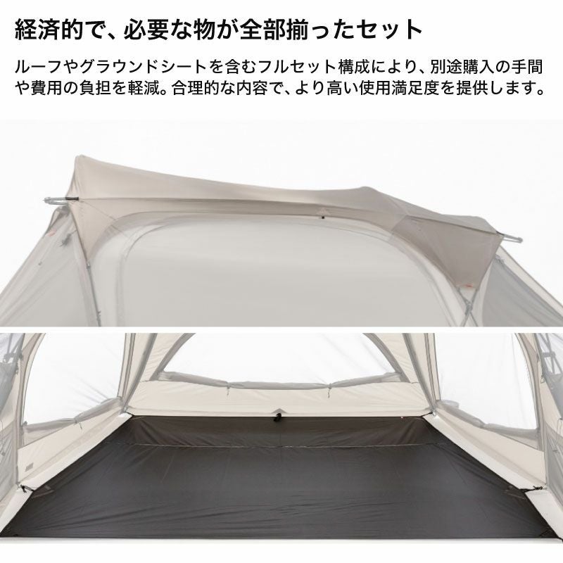構成:本体、インナーテント、ルーフ、グランドシート、フロントポール×1、リアポール×2、リッジポール×2、アップライトポール×2、スチールペグ×18、ストリング×8(本体接続用×4)、ポール修理キット、収納ケース、フラグ