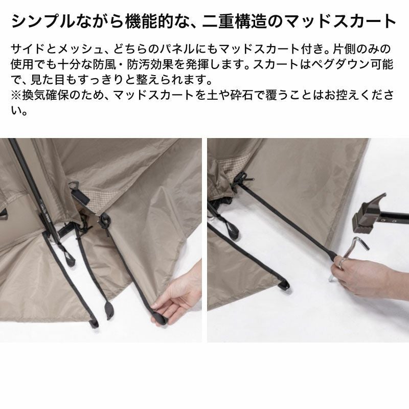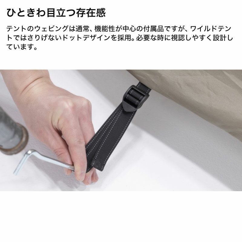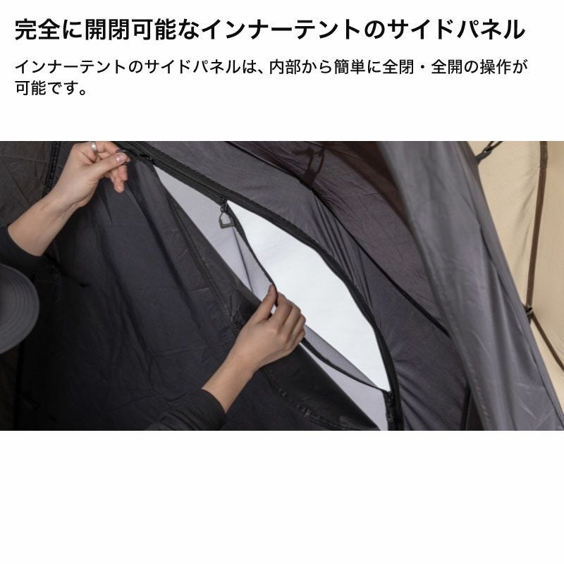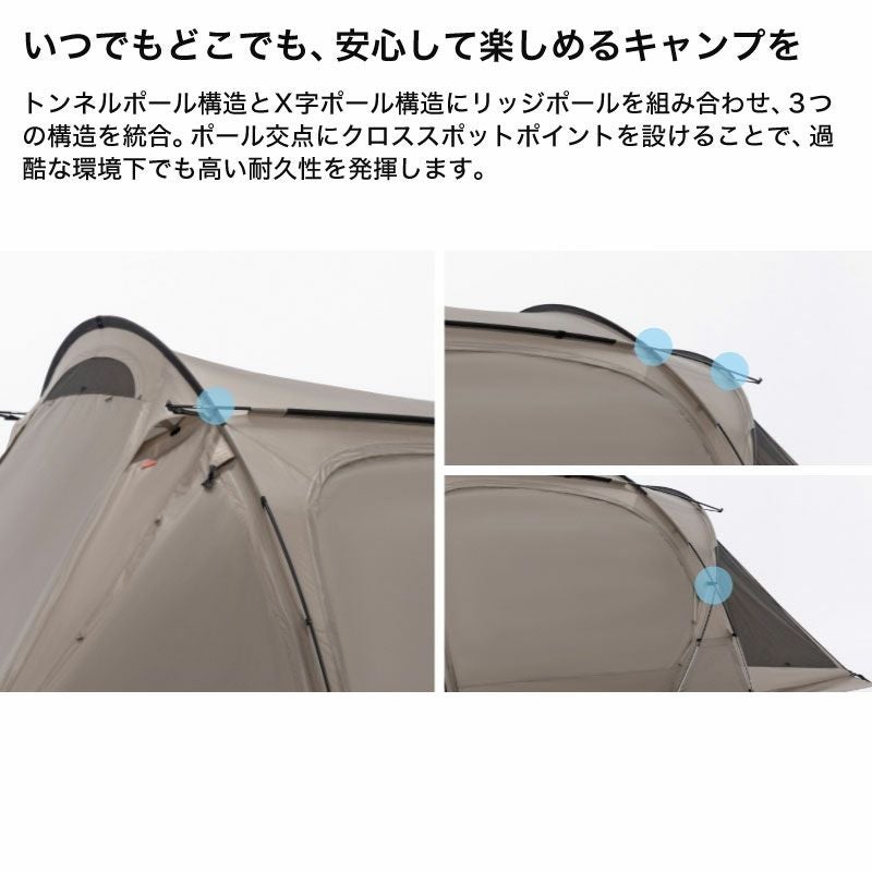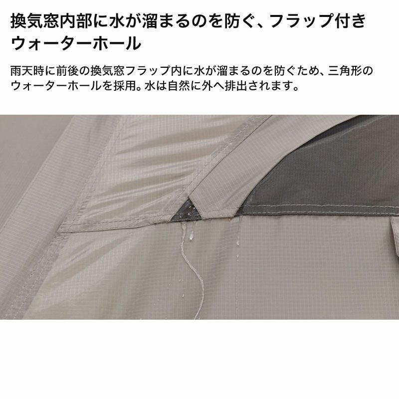 材質:本体-ポリエステル(68Dポリリップストップ、耐水圧2,000mm、PU、WP、WR、FR)、インナーテント-ポリエステル(68Dポリタフタ、WR)、床-ポリエステル(150Dポリオックスフォード、耐水圧2,000mm、PU、WP、WR)、ルーフ-ポリエステル(68Dポリリップストップ、耐水圧2,000mm、PU、WP、WR、FR)、グラウンドシート-ポリエステル(150Dポリオックスフォード、耐水圧2,000mm、PU、WP、WR)、ポール-フロントポール・デュラルミン直径14.5/リアポール-デュラルミン・直径13/リッジポール・デュラルミン直径14.5/アップライトポール・スチール直径16