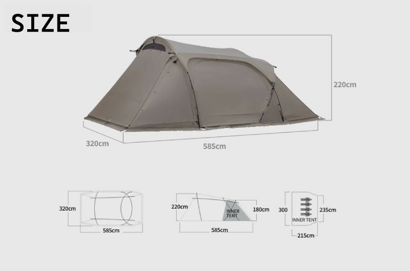 サイズ:本体-585×320×220cm(設置時)/インナーテント-215×300(235)×180cm(設置時)、グラウンドシート:205×290(225)cm