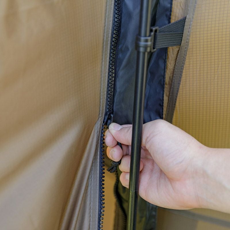 ゴーストシェルター専用ヘキサタープ。 シェルターとターフをジッパーで簡単に接続可能! ゴーストシェルターと繋がった活動的な空間。 ナイロンリップストップ生地使用で耐久性が強い! 単独設置で大型ヘキサタープにも。
