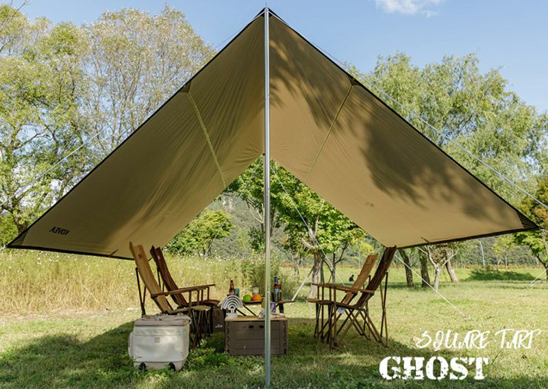 4人以上使用に適した正方形のタープ。 日差しと雨を防ぎ、補助ポールを追加するとさらに空間を広く使える! ナイロンリップストップ生地使用で耐久性が強い!