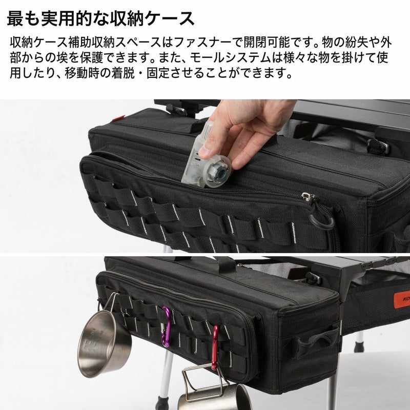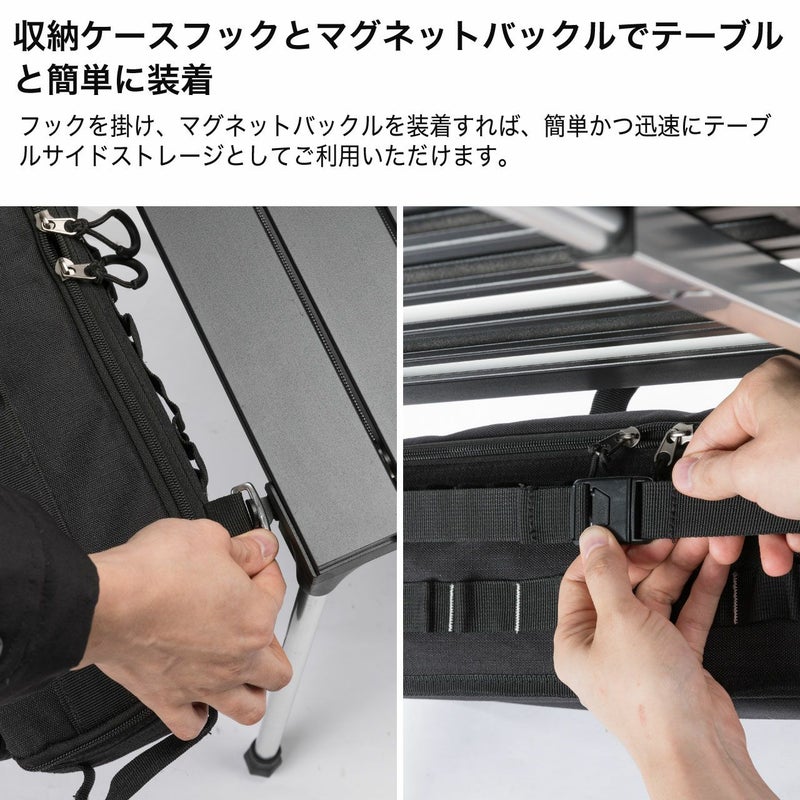 収納ケースをテーブルサイドに掛けてカトラリーや調理器具、ガス缶などを入れるサイドストレージとして使用できます。
