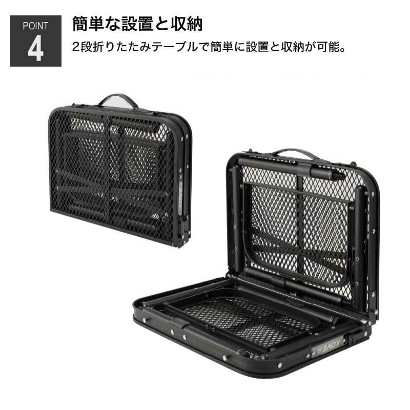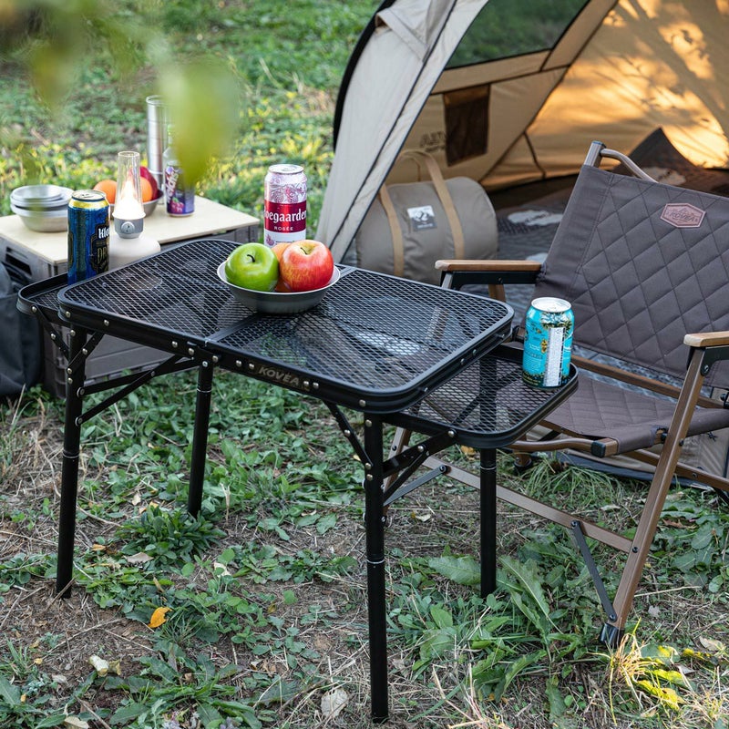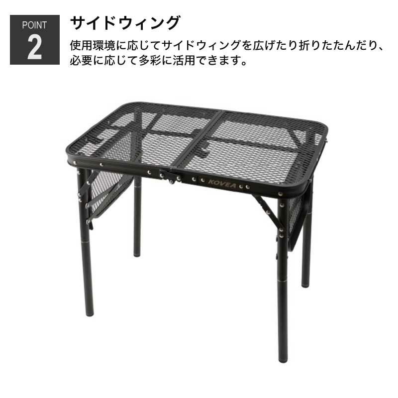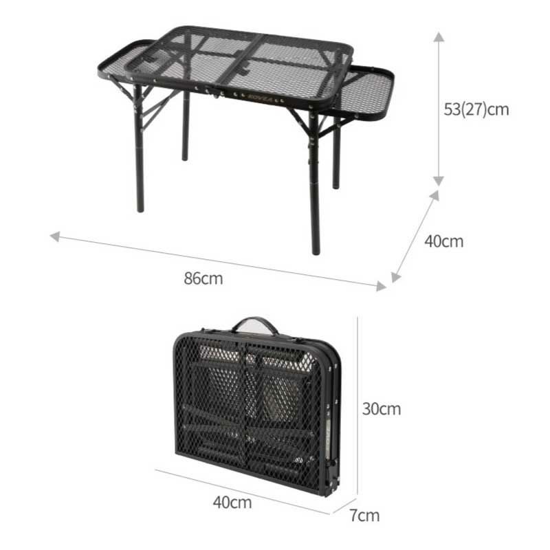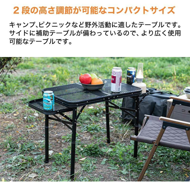 従来のメッシュウィングテーブルのアップグレードバージョンとして、補助脚を使用して2段で高さ調整可能で、キャンプ、ピクニックなど野外活動に適したテーブルです。
