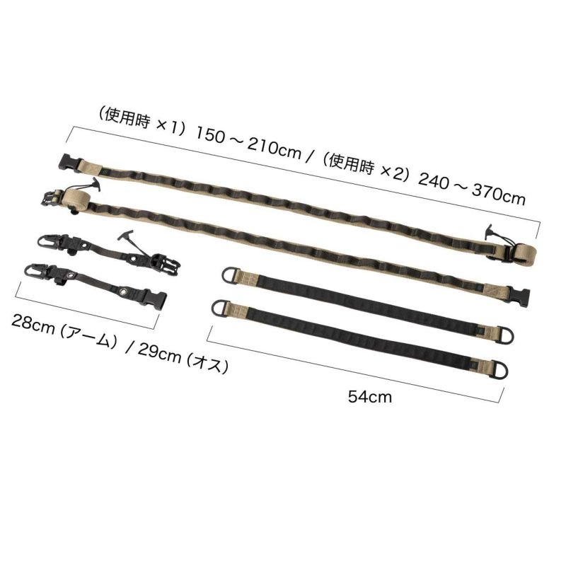 サイズ:メインウェビング/160cm、ノンスリップウェビング/54cm、アダプター(オス)/29cm、アダプター(アーム)/28cm、デイジーチェーン(使用時×1)150~210cm、(使用時×2)240~370cm(ノンスリップウェビング、カラビナ活用延長可能)/圧縮ウェビング活用-030~250cm 重量:330g(収納ケース含む)
