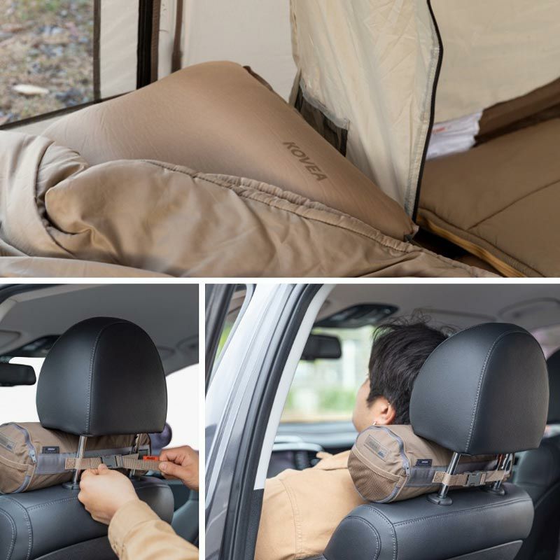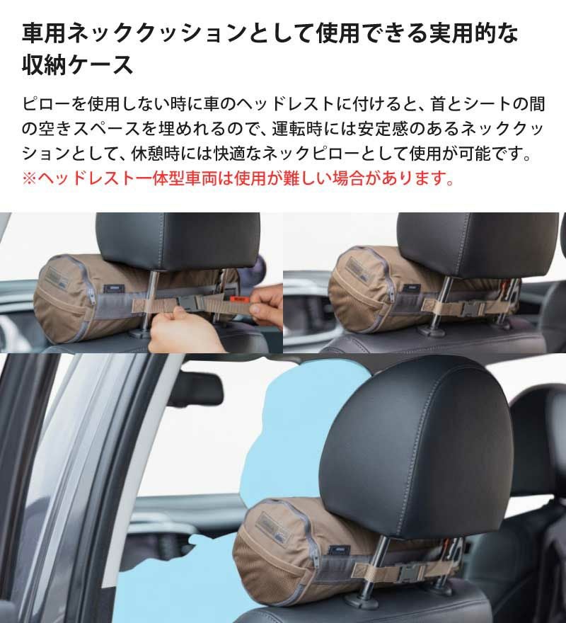 収納ケースを利用し、普段は車でネッククッションとして、キャンプ時にはピローとしても使用可能です。