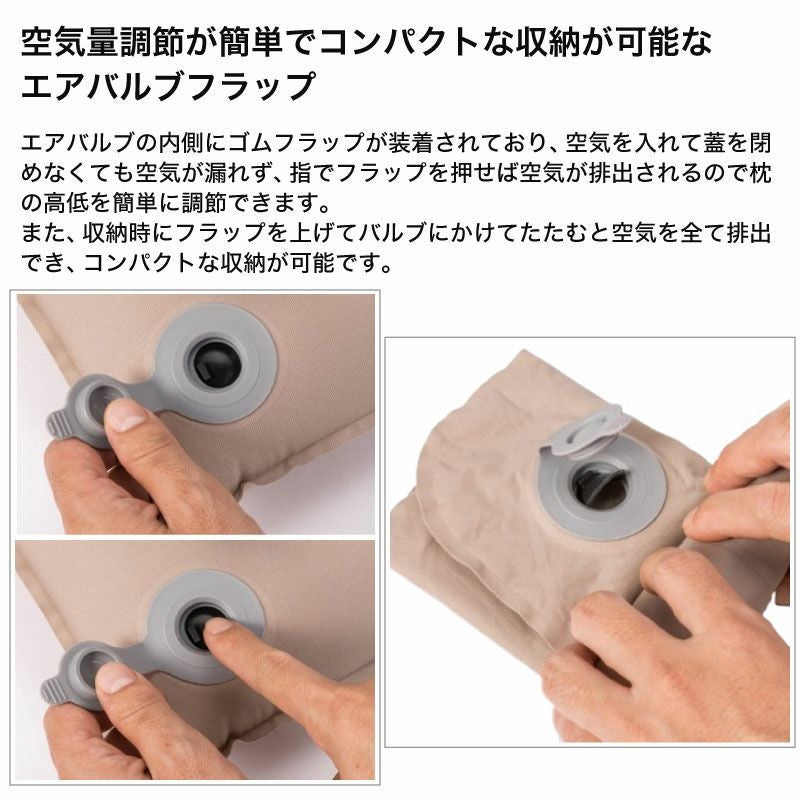 フラップバルブにより空気を簡単に注入・排出することができ、フラップを押して簡単な高さ調節が可能です。