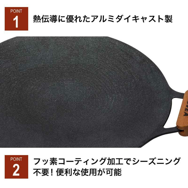 熱伝導に優れたアルミダイキャスト製で軽く、フッ素樹脂コーティングを施し、シーズニングなしで便利な使用が可能です。