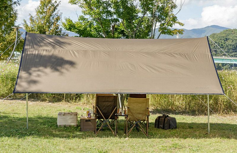 4人以上使用に適した正方形のタープ。 日差しと雨を防ぎ、補助ポールを追加するとさらに空間を広く使える! ナイロンリップストップ生地使用で耐久性が強い!