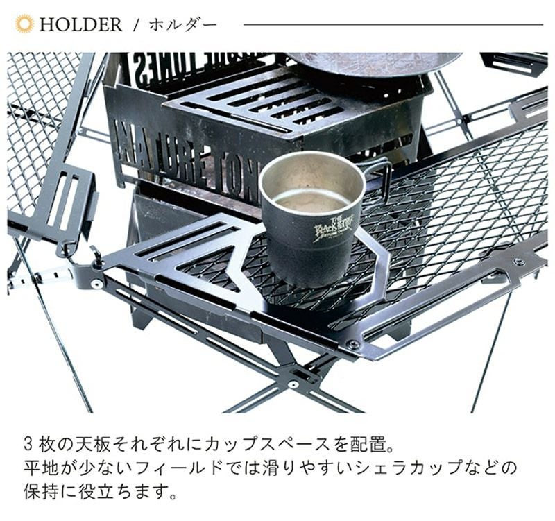 平地が少ないフィールドでは滑りやすいシェラカップなどの保持に役立ちます。