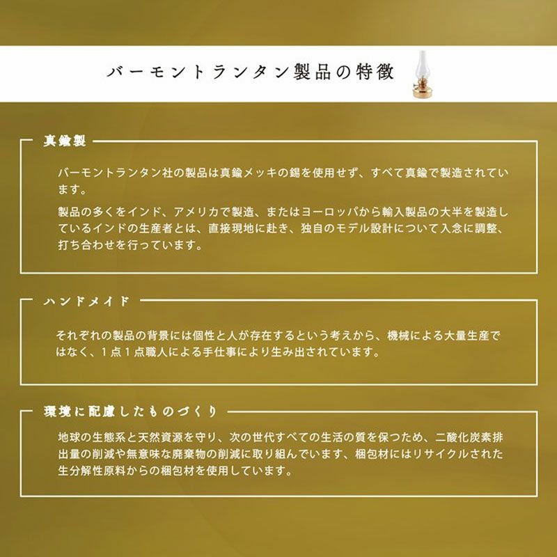 他の画像を見る バーやアウトドアイベントで使われるランタンとして最高のクラシックシリーズ Vermont Lanterns バーモントランタン オイルランプ ミニ 6.5 ブラス シルバー アンティークブロンズ 販売価格 ¥ 5,470 税込 カートに入れる お気に入りに登録する