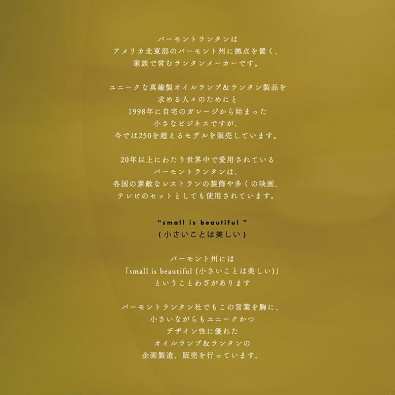他の画像を見る バーやアウトドアイベントで使われるランタンとして最高のクラシックシリーズ Vermont Lanterns バーモントランタン オイルランプ ミニ アンバーグラス 5.7 ブラス アンティークブロンズ 販売価格 ¥ 6,570 税込 在庫切れ カートに入れる お気に入りに登録する