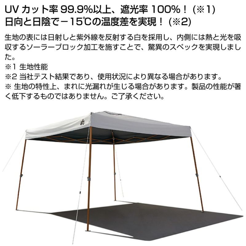表側の白は太陽光を反射させ、裏側の黒で熱をブロックするので、日陰と日向で最大15℃もの温度差を生みだす(※LOGOS調べ)。