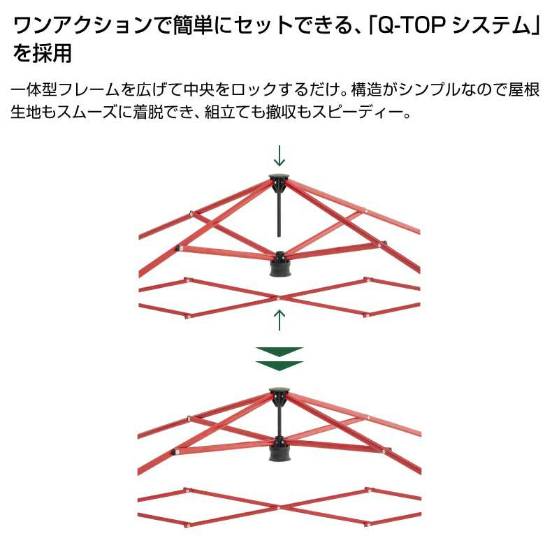 ワンアクションでフレームが広がるQ-TOPシステム採用で、少人数でも簡単に組立てることができます。