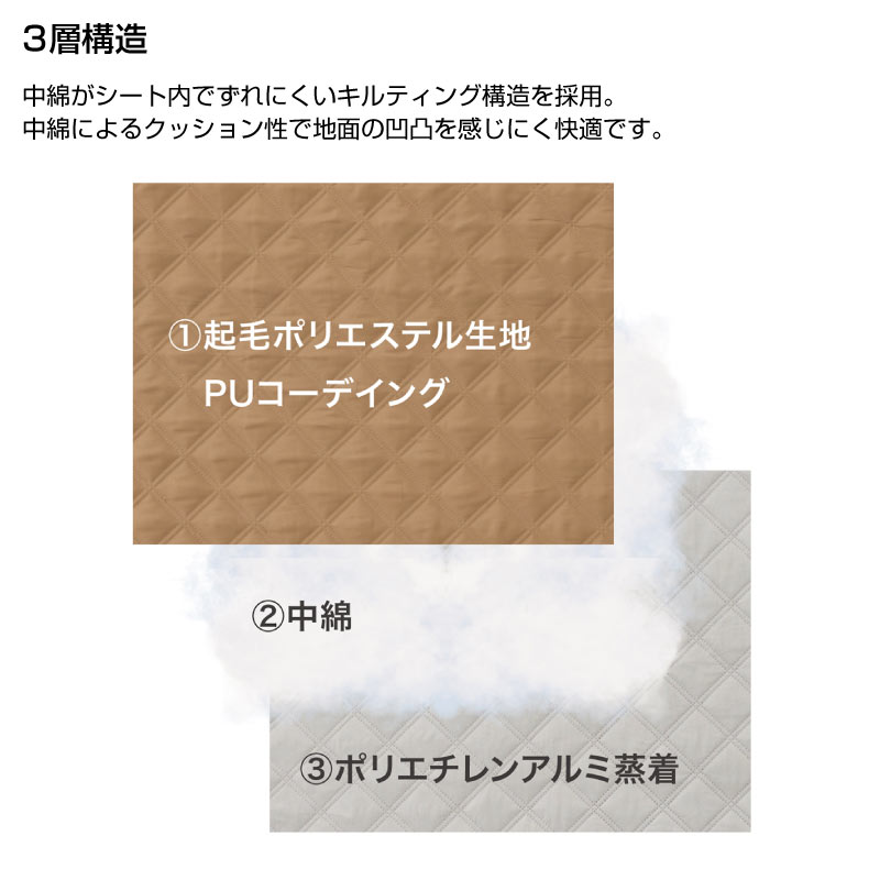 中綿入り3層キルティング構造でクッション性があり、地面の凹凸を感じにくく快適。