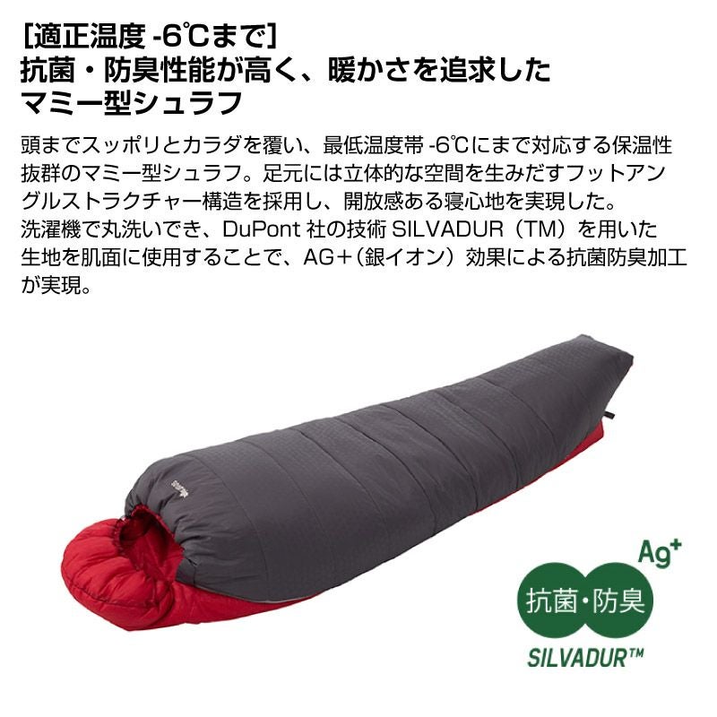 最低温度帯-6℃にまで対応する保温性抜群のマミー型シュラフ。丸洗いも可能!