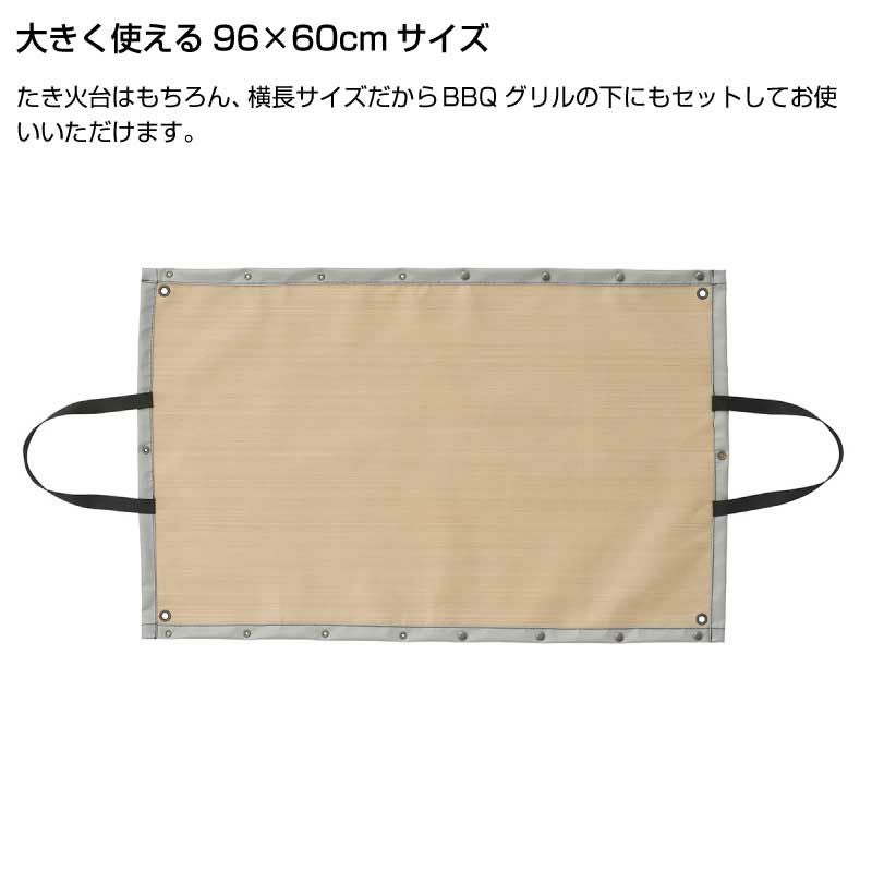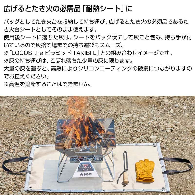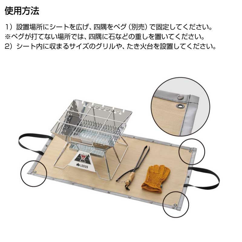 ※本製品はロゴスピラミッドグリルなど熱源から地面まで十分な距離のある「焚き火台」の平均的な熱量を使用基準として設計され、設置場所に伝わる熱をやわらげることを目的としております。熱を完全に遮断するものではありませんのであらかじめご留意ください。