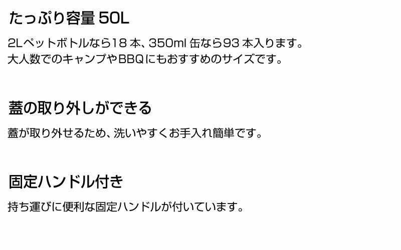 2Lペットボトルなら18本、350ml缶なら93本入る容量50Lで、大人数でのキャンプやBBQにもおすすめ!