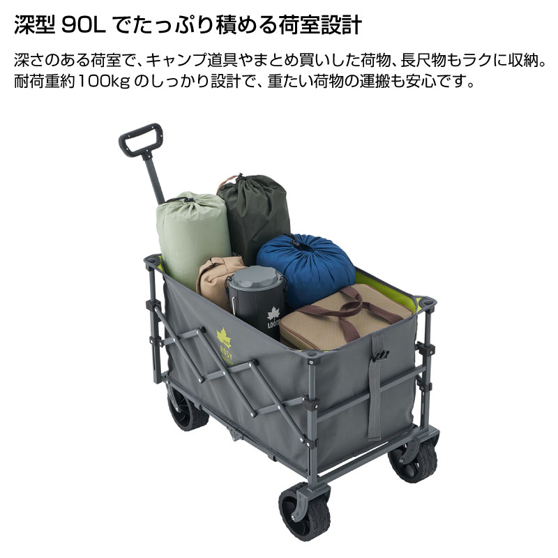 容量約90Lの大容量で、キャンプ用品やまとめ買いの荷物もたっぷり運べます。