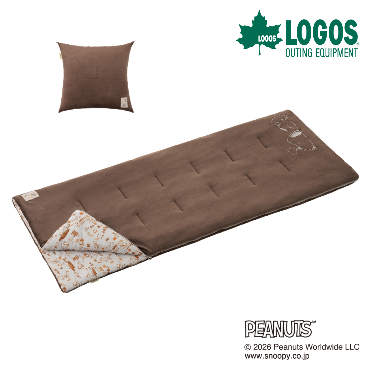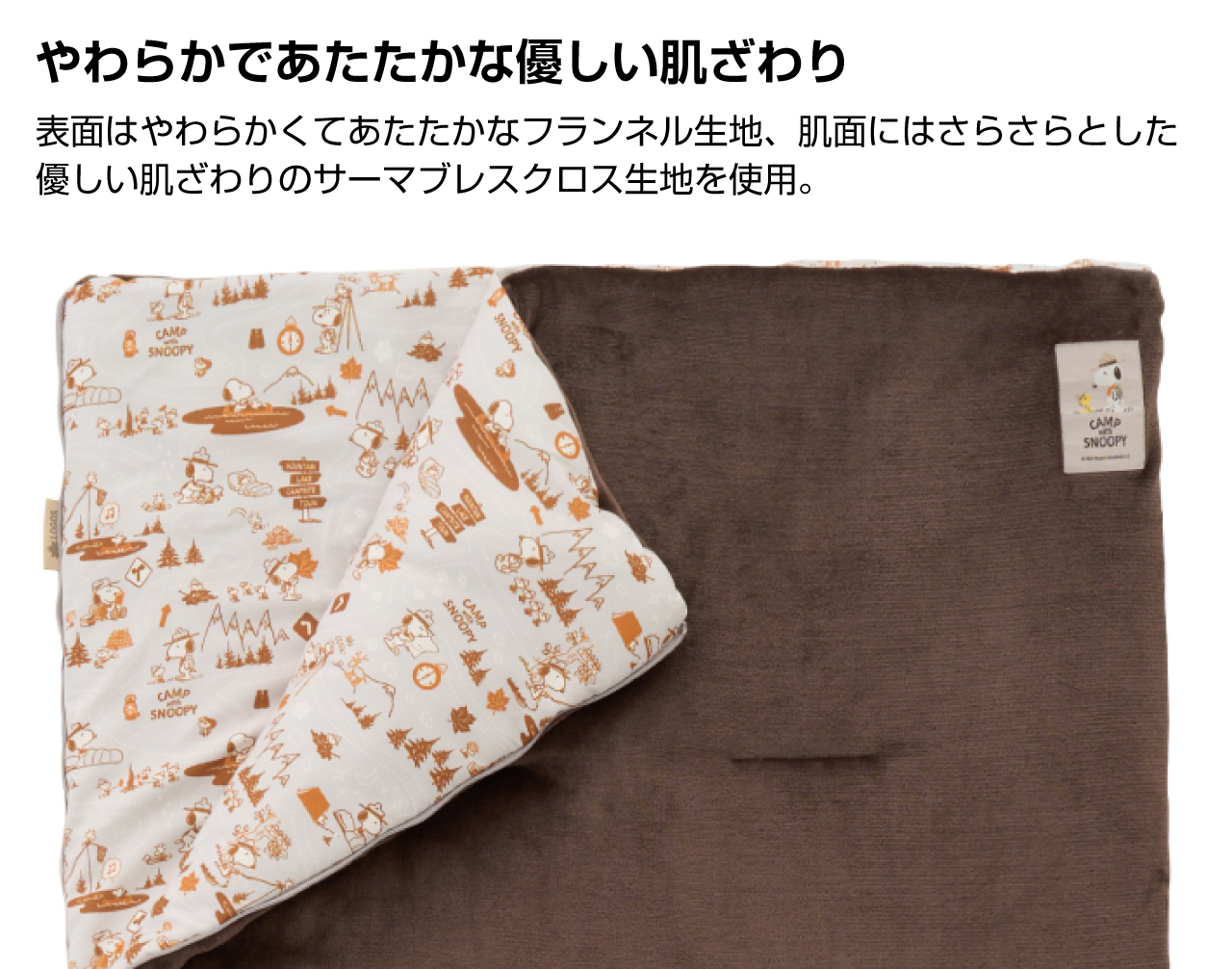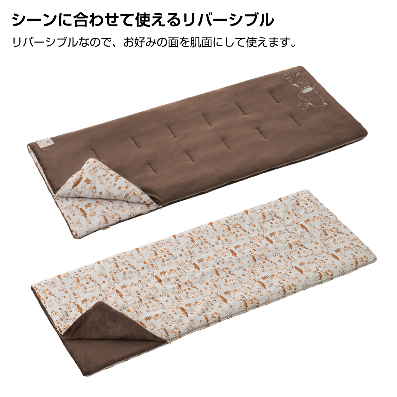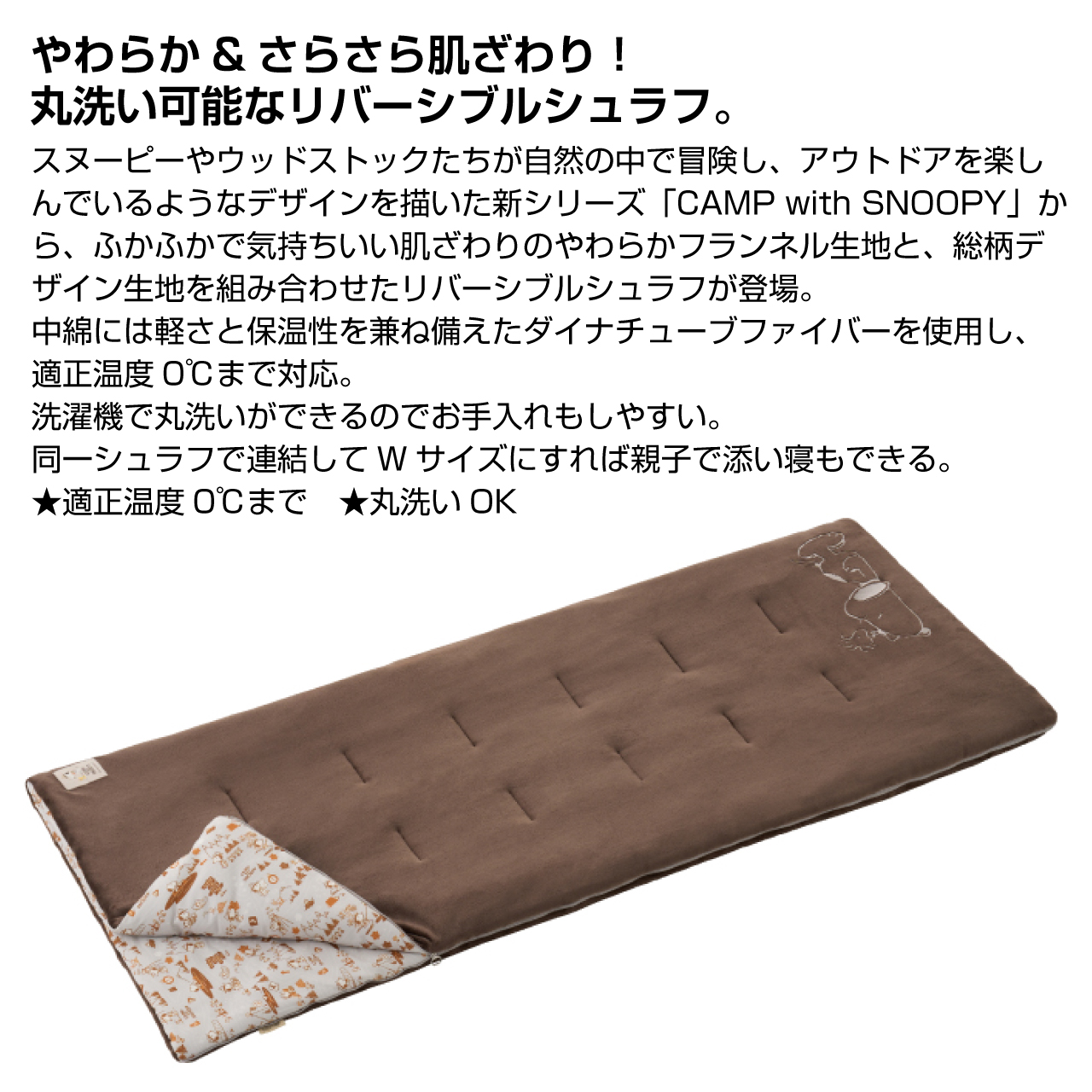 スヌーピーやウッドストックたちが自然の中で冒険し、アウトドアを楽しんでいるようなデザインを描いた新シリーズ「CAMP with SNOOPY」から、ふかふかで気持ちいい肌ざわりのやわらかフランネル生地と、総柄デザイン生地を組み合わせたリバーシブルシュラフが登場。
