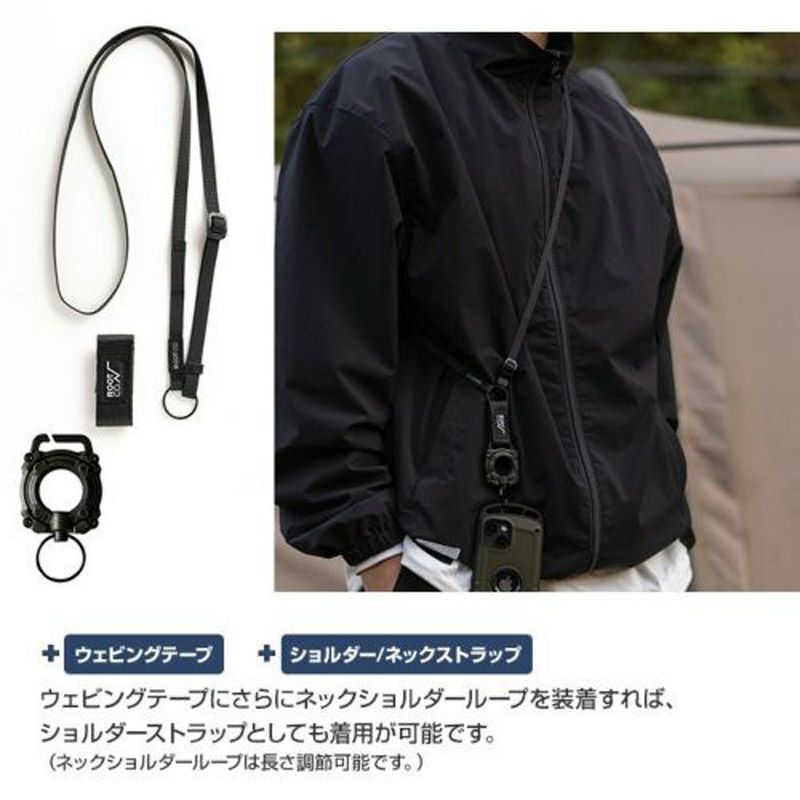 さらに、ショルダーストラップ・ウェビングテープ・二重リング・ストラップパーツといったアタッチメントが付属しているので、シーンに応じて自由に使い方や吊り下げ方の切り替えが可能です。