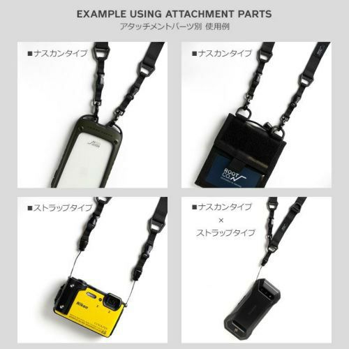 アタッチメントパーツは「ナスカンタイプ」と「ストラップタイプ」の両方がセットになっているので、カメラやストラップ穴や小さなループがあるスマートフォン・マルチツールにも対応可能。