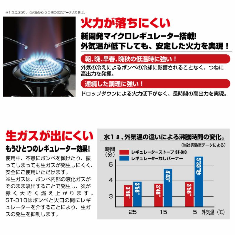 低温の外気により、火力低下を起こしやすいCB缶の弱点をマイクロレギュレーターが解消。